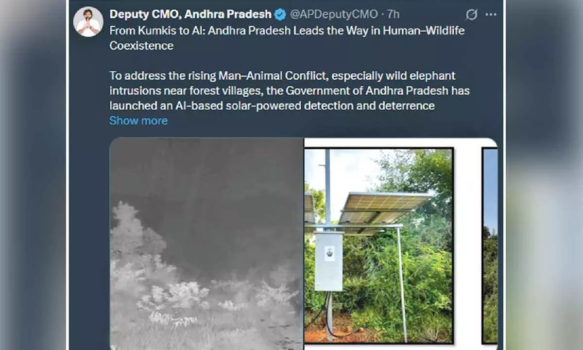 In a social media post, Pawan Kalyan explained that an AI-based monitoring system has been introduced on a pilot basis in Chittoor district to track elephant movement near forest-bordering villages. Powered by solar energy, the system detects elephant activity and generates mild deterrent signals to guide the animals back into the forest. The mechanism also alerts forest department officials in real time, allowing immediate response to potential threats. He recalled that four trained ‘Kunki’ elephants were earlier brought from Karnataka to assist in driving away wild herds safely. The Kunki teams, he said, have already succeeded in diverting elephants that entered human settlements on several occasions.