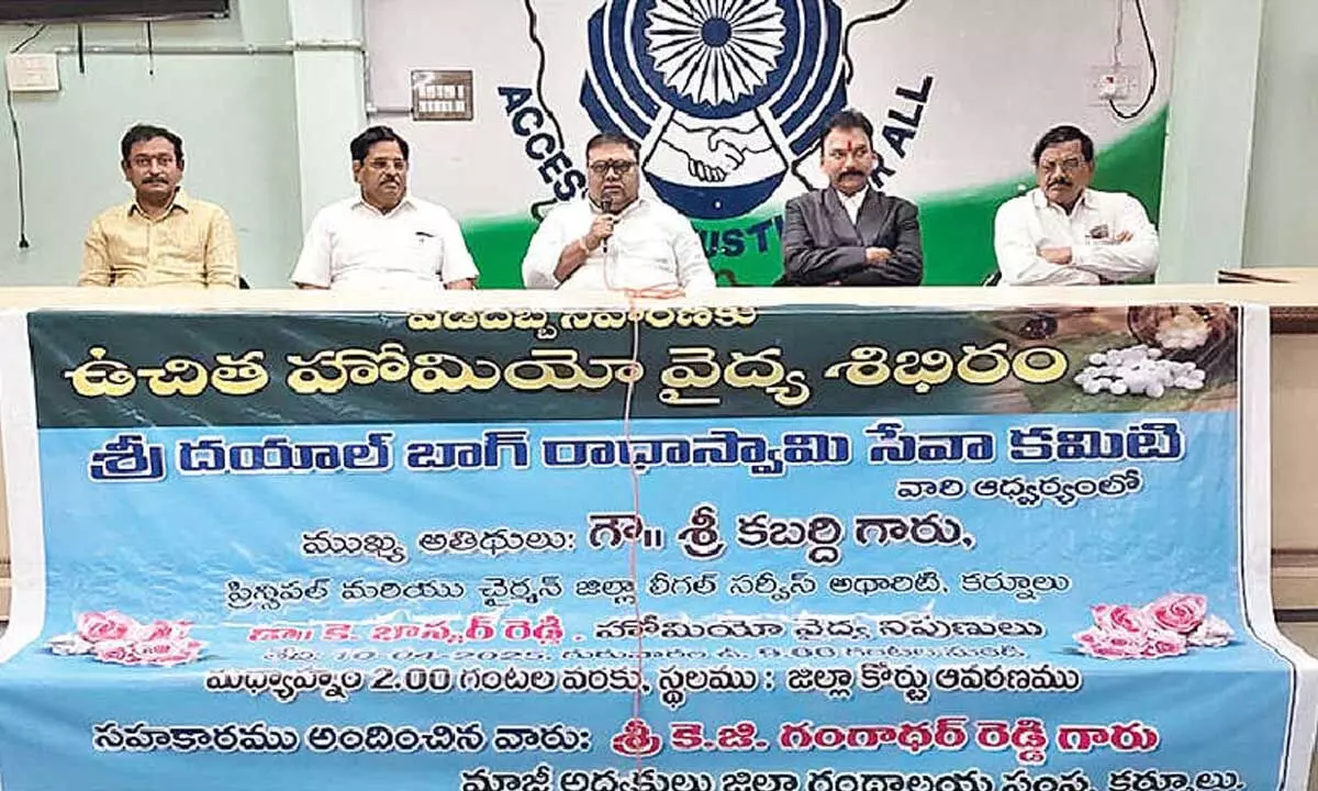 Kurnool: On World Homeopathy Day, a free homeopathy medical camp was organised at Nyaya Seva Sadan in Kurnool on Thursday, under the joint aegis of Kurnool District Legal Services Authority and Dayalbagh Radhasoami Seva Committee.
