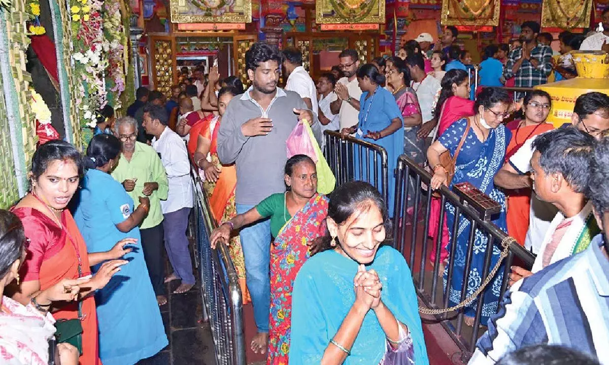 Vijayawada: With Sankranti holidays over, devotees thronged Durga temple atop Indrakeeladri here on Sunday. A noticeable increase in footfall was witnessed as pilgrims and travellers, particularly those returning to Hyderabad after the holidays, stopped to seek the blessings of Goddess Kanaka Durga before resuming their journeys.