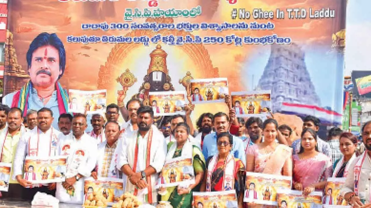 Party leaders installed a large flex banner highlighting the Tirumala laddu controversy and distributed authentic laddus from Tirumala to devotees.