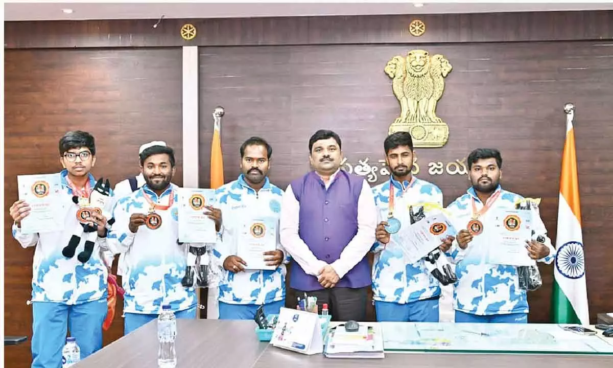 Recognising their achievement, district Collector P Ranjith Basha felicitated the athletes and their coach Narendra on Wednesday. He congratulated them on their success and encouraged them to continue excelling at national and international levels. The athletes were honored with certificates and medals for their outstanding performances.