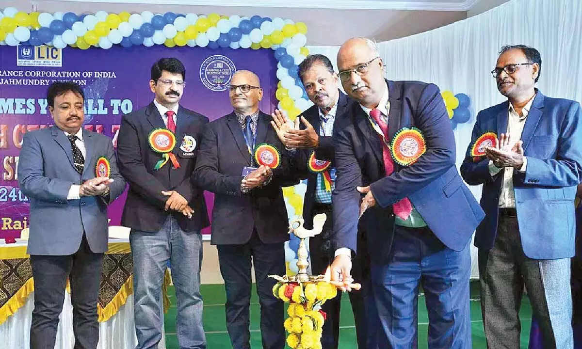 Satyanarayana Sahu, Senior Divisional Manager, LIC Rajahmundry lighting the traditional lamp