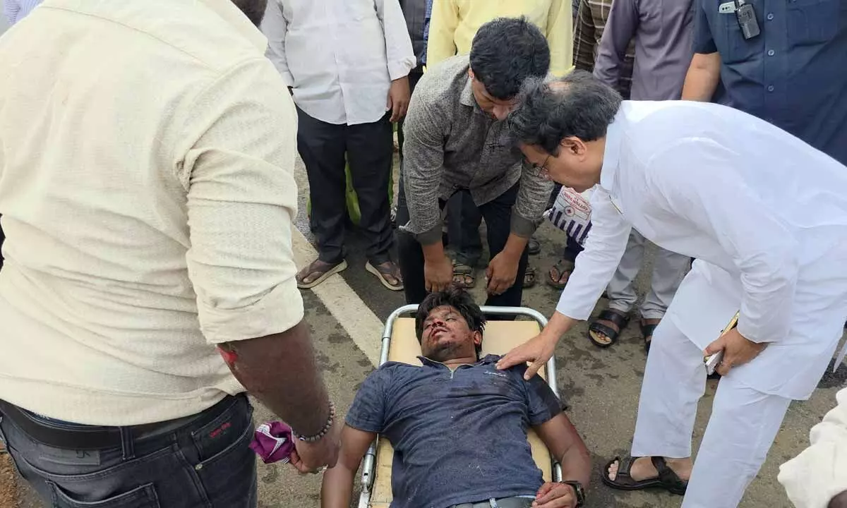 Two people riding a bike were seriously injured when an Innova car collided with the two-wheeler on national highway. The Minister, who noticed the accident, immediately stopped his vehicle and helped the injured. He called an ambulance and made arrangements to take them to hospital.