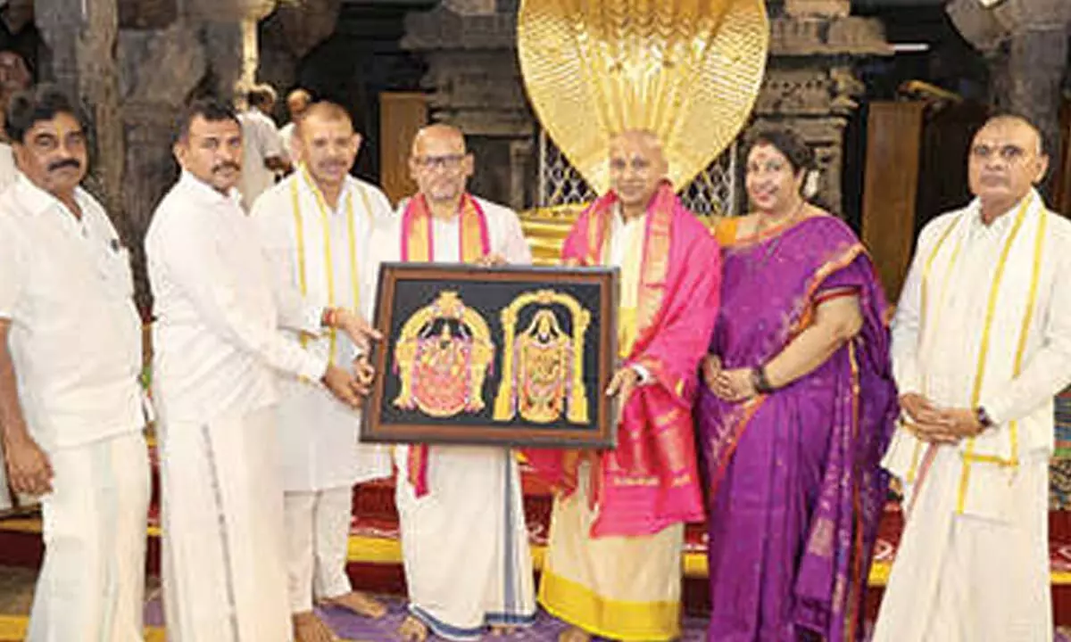 After offering prayers to Sri Venkateswara, the EO and his spouse were offered Vedic blessings by temple priests at the Ranganayakula Mandapam. On this occasion, the Additional EO presented them with Theertha Prasadams.