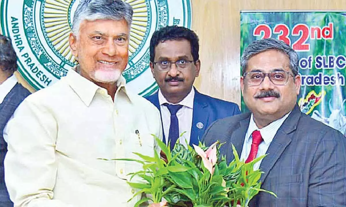 Chief Minister Nara Chandrababu Naidu being greeted at the State-Level Bankers' Committee (SLBC) meeting in Amaravati on Tuesday
