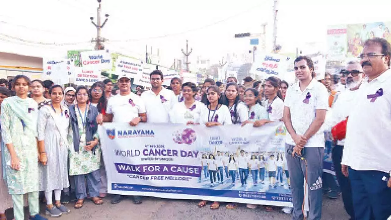 On World Cancer Day, Narayana Medical College Hospital organised an awareness rally from Gandhi statue to RTC bus stand in Nellore on Wednesday.