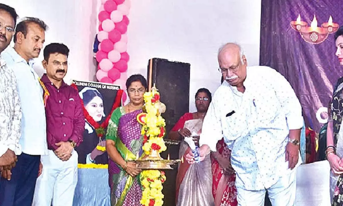 On Thursday, a lamp lighting and capping ceremony was held at Bollineni Nursing College in Nellore Rural Dhanalakshmipuram to welcome new nursing courses.