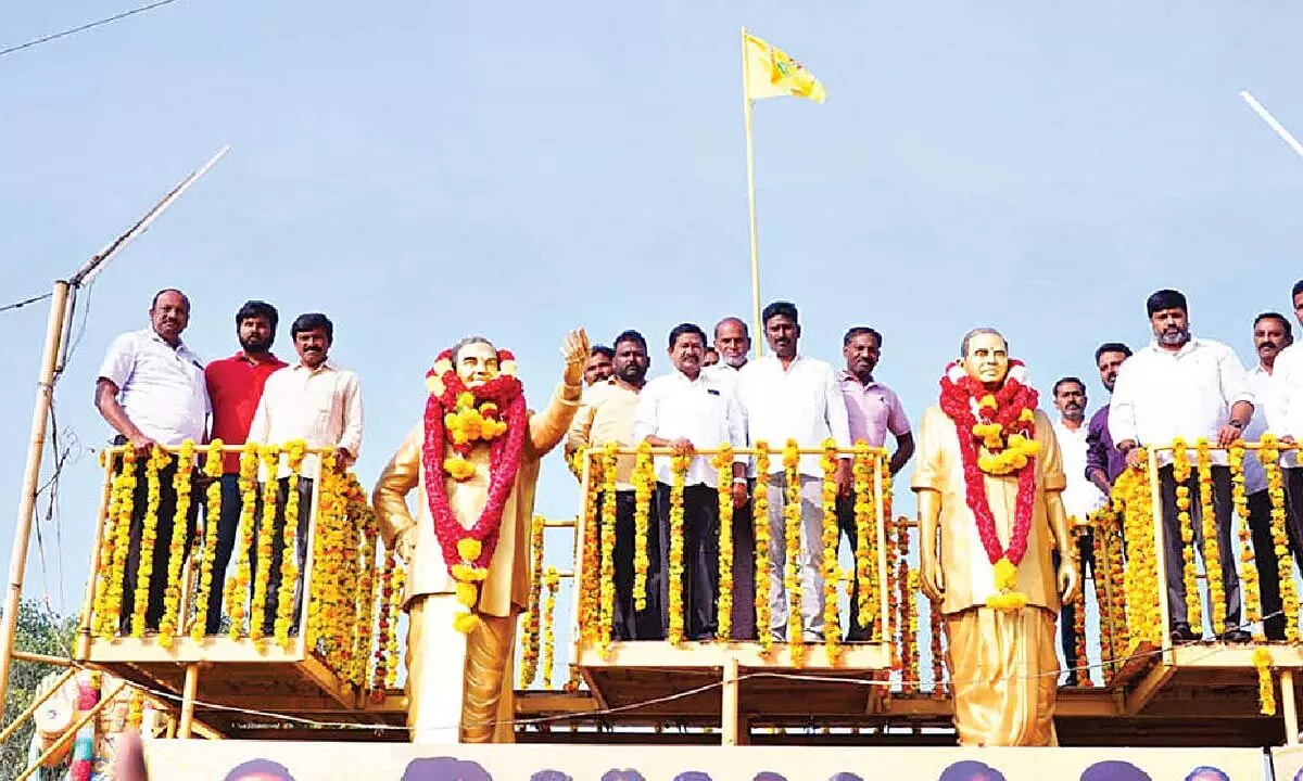 Kondapi: Minister Dola Sree Bala Veeranjaneya Swamy and Maritime Board Chairman Damacharla Satya paid tributes to the statues of NT Ramarao and Damacharla Anjaneyulu at Turpu Nayudupalem, commemorating their party founder’s death anniversary.