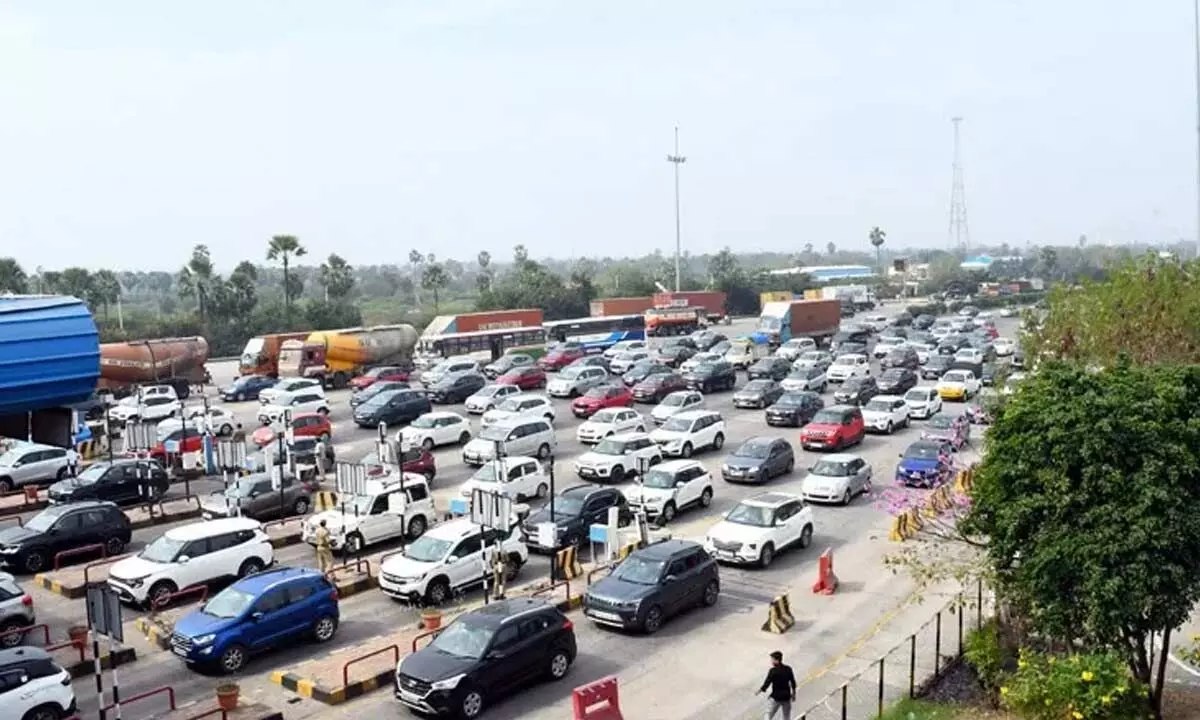 Traffic congestion persisted for five consecutive days on the Hyderabad-Vijayawada National Highway, culminating in a record high of 71,284 vehicles passing through on Saturday alone. The numbers were substantial throughout the week, with 53,000 vehicles recorded on Friday, 62,000 on Sunday, 56,000 on Monday, and 62,000 on Tuesday. In total, 304,000 vehicles travelled in both directions through the Pantangi toll plaza over the span of the five days. Of these, 204,000 vehicles were headed towards Vijayawada.