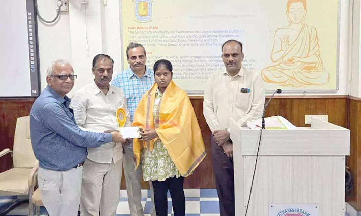 Vemuri Babu Rao, director of PB Siddhartha College presented Rs 7,000 prize money to the champion Sarvani Cheedella. Faculty Sridhar Kavuri and Abburi Rama Rao also participated in the programme.