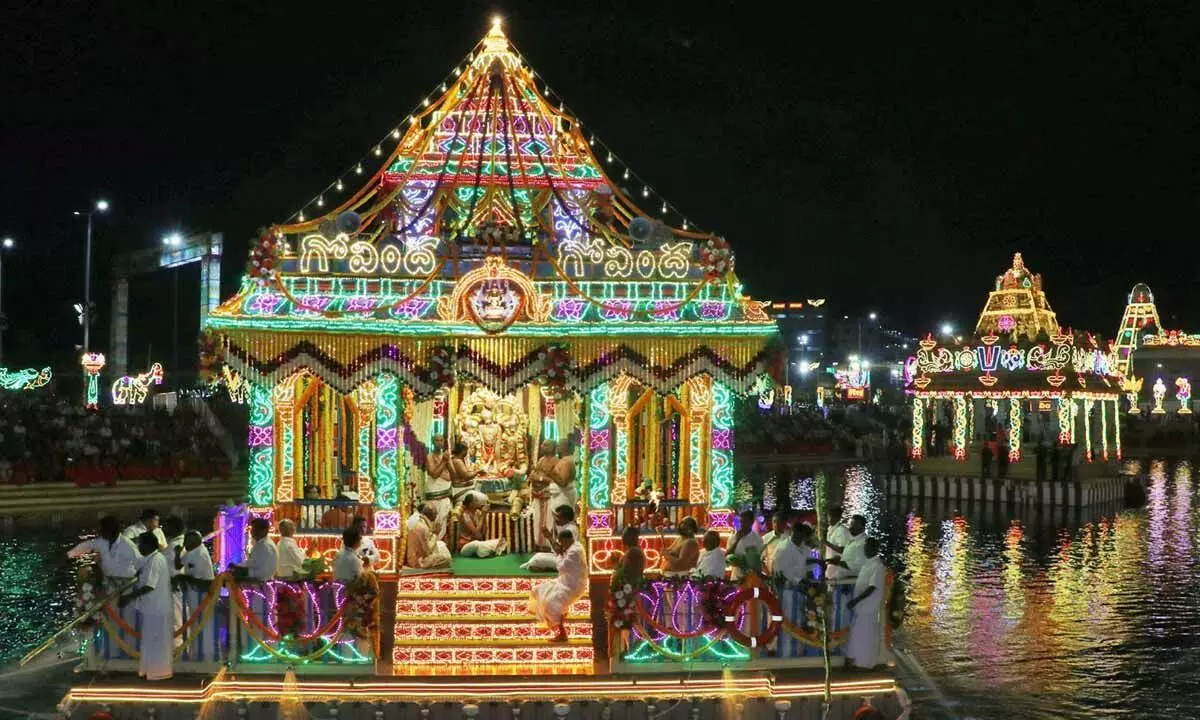 Tirumala: Srivari Salakatla Teppotsavam started in Tirumala on Sunday evening. Sri Ramachandra Murthy along with Sita, Lakshmana and Anjaneya appeared on a boat finely decorated with electric lamps and flowers.