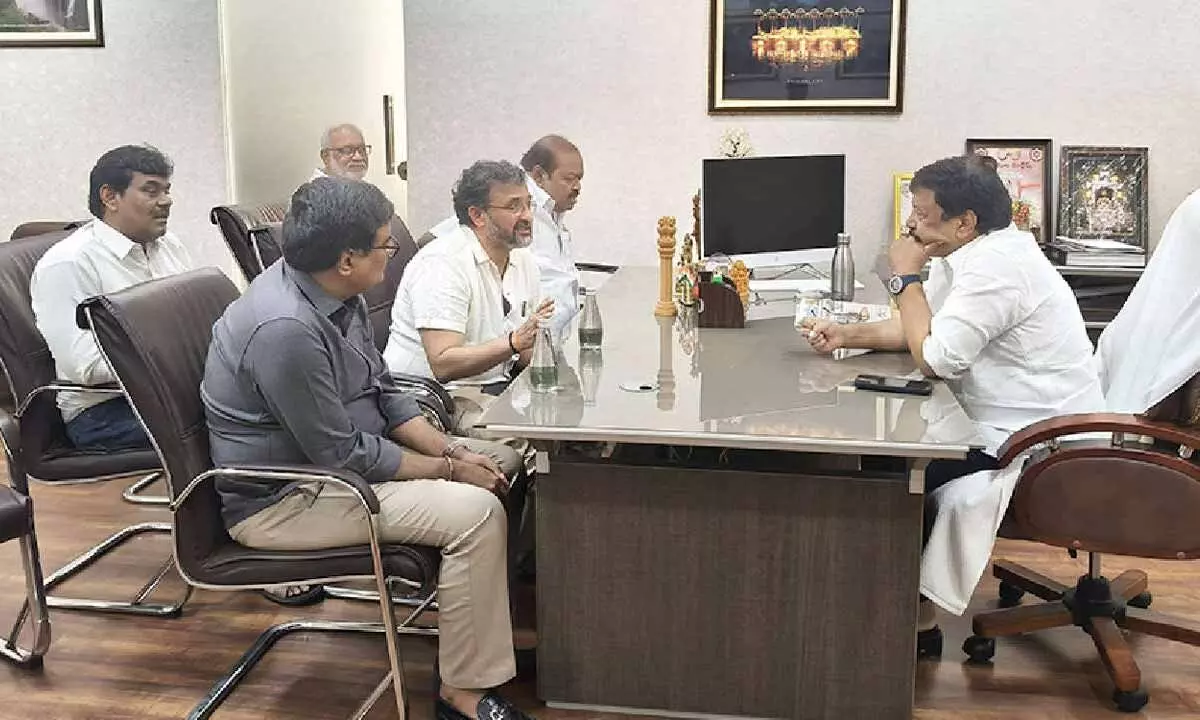 Earlier, committee members including director Jasti Dharmateja (Teja), distributor Nakkalapudi Saibabu, producer Kuchibhotla Vivek, and exhibitors Sompalli Shiva Prasad and Alankar Prasad met the minister to share their views. The meeting concluded with a felicitation of minister Durgesh.
