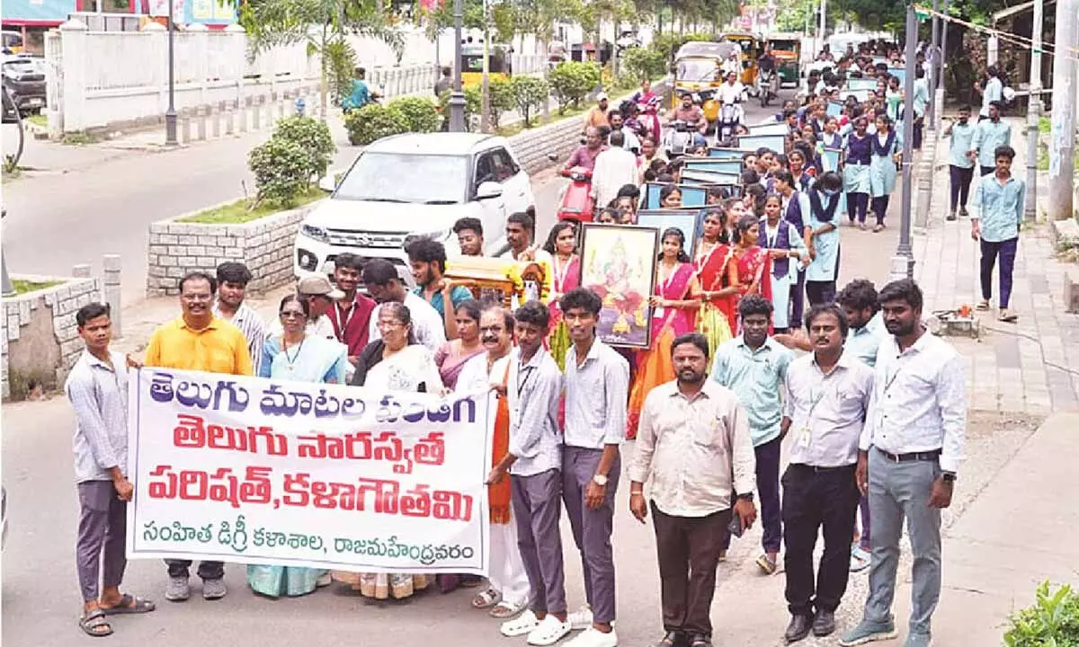 Natyacharya Dr Sappa Durga Prasad called on students to cultivate respect and pride for their mother tongue. The event was conducted under the supervision of Dr PVB Sanjeeva Rao, with participation from PVS Krishna Rao, Desareddy Balarama Naidu, Vinod Kumar, Thota Ramakrishna, Achanta Chandrasekhar, Ravikumar, Cheerla Sitaramanayudu and others. A grand rally by students was organised, carrying portraits of the Akshara Devatas (letter deities) from the Nannayya statue at Anam Kala Kendram to the statue of Rajaraja Narendra at Pushkara Ghat drawing large participation and enthusiastic response.