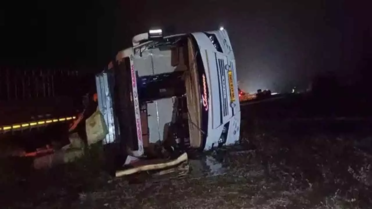 Nandyal: A tragic road accident occurred in Nandyal district on Thursday early morning when a private bus lost control after a tyre burst, crossed the median and rammed into an oncoming lorry. Moments after the collision, the bus caught fire, creating panic among passengers and resulting in the death of three persons on the spot, while several others sustained injuries.