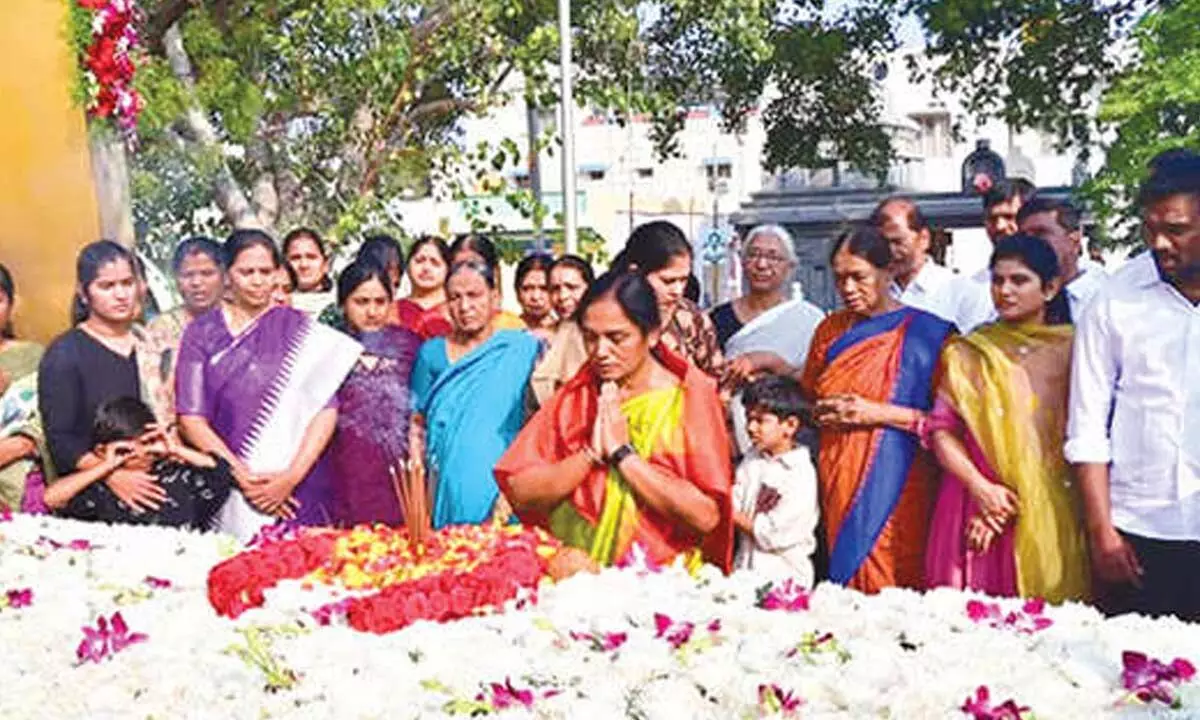 Raptadu MLA Paritala Sunitha and Dharmavaram TDP in-charge Paritala Sriram, along with family members, offered special prayers and floral tributes at the Paritala memorial. Prominent leaders from various regions also paid their respects. The event included a community feeding program inaugurated by Sunitha and Sriram.
