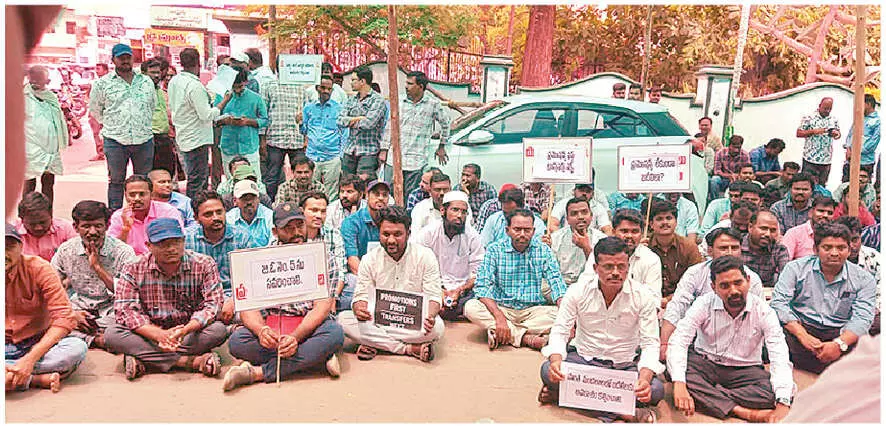 ULB secretariat employees staging protest in front of Kurnool Municipal Corporation.