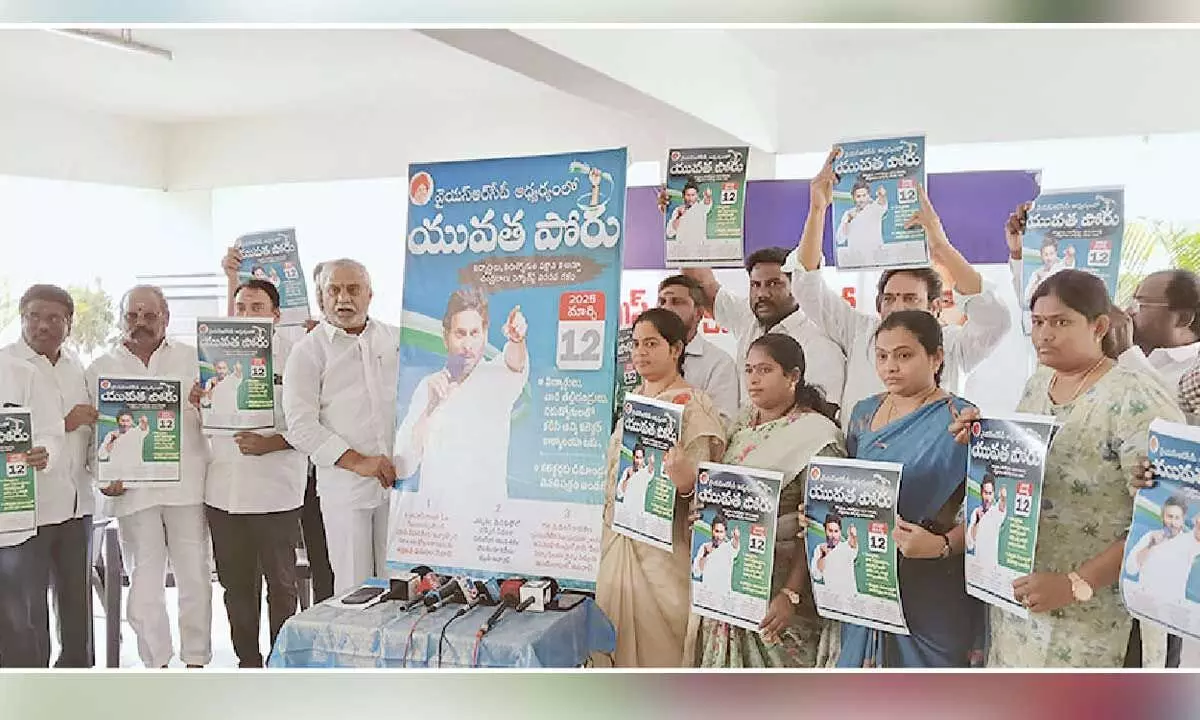 Vijayawada: YSRCP called on the youth across the state to join the YuvataPoru along with their parents to be organised by the party on Wednesday. Former MLA Malladi Vishnu while releasing the Yuvata Poru posters along with deputy mayor of Vijayawada Municipal Corporation Avutu Sri Sailaja Reddy and YSRCP corporators at JanahitaSadanam here on Monday, called upon the youth to participate in the YuvataPoru in large numbers.