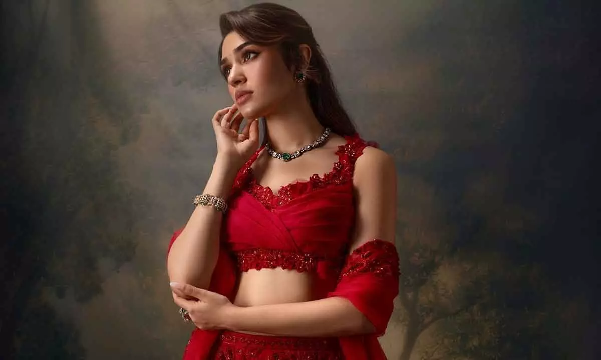 Draped in a stunning red sleeveless blouse paired with a matching flowy skirt and dupatta, Krithi exuded elegance and grace. Adding a perfect touch of contrast, she accessorized her look with a striking emerald green necklace, while her loose tresses cascaded down like a dream, making her appearance nothing short of regal.