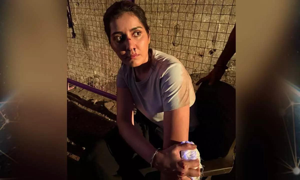 Raashii took to Instagram, where she shared a slew of images. In the photographs, the actress appeared bruised, bloodied, and intensely focused. She could be seen in a simple T-shirt and black pants, with the visible injuries on her nose and hand.