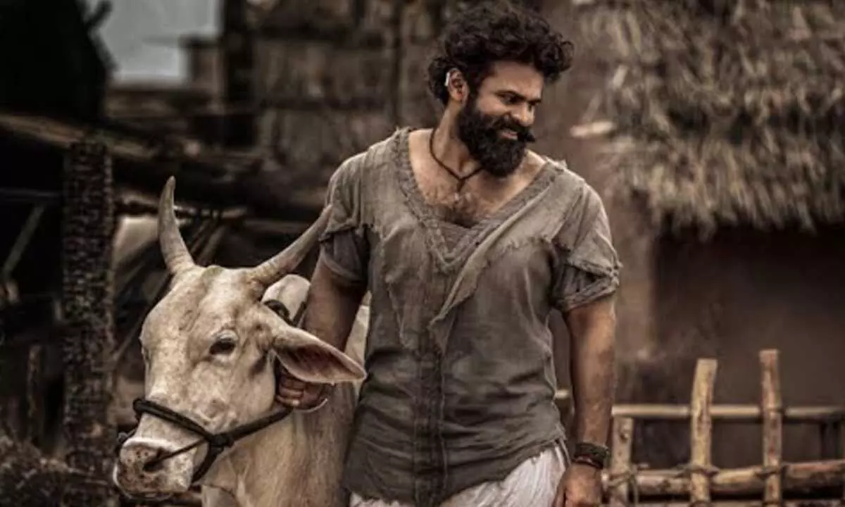 The poster showcases Sai Durgha Tej in an earthy, completely rooted village look. Wearing a grey shirt and traditional panche kattu, SDT is seen walking barefoot through a rural backdrop, gently guiding a majestic white bull. His thick beard, intense eyes, and subtle smile capture both grit and warmth, adding layers to his rustic transformation.