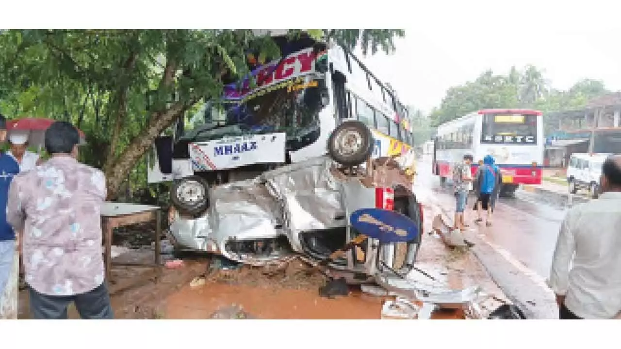 According to preliminary information from police sources, the incident took place when a private bus travelling from Puttur to Mangaluru reportedly rear-ended a car that was attempting a right turn towards Kedila. The collision occurred during an overtaking manoeuvre by the bus, leading to a forceful impact that caused the car to overturn.