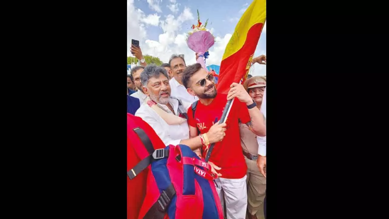 RCB team gets grand welcome: Shivakumar gifts Kannada flag to Virat Kohli