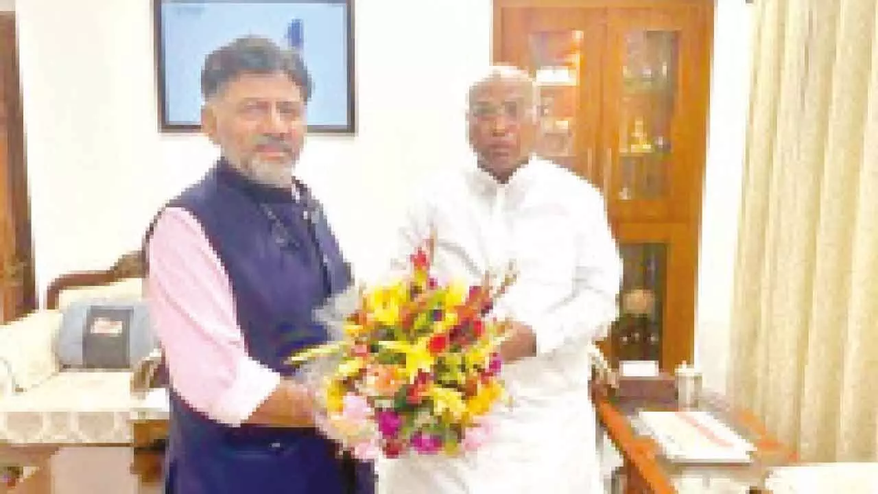 Bengaluru: Deputy Chief Minister D K Shivakumar on Thursday met Congress President Mallikarjun Kharge at his residence here, leading to speculations linking it to the ongoing power tussle in the state for the CM post.