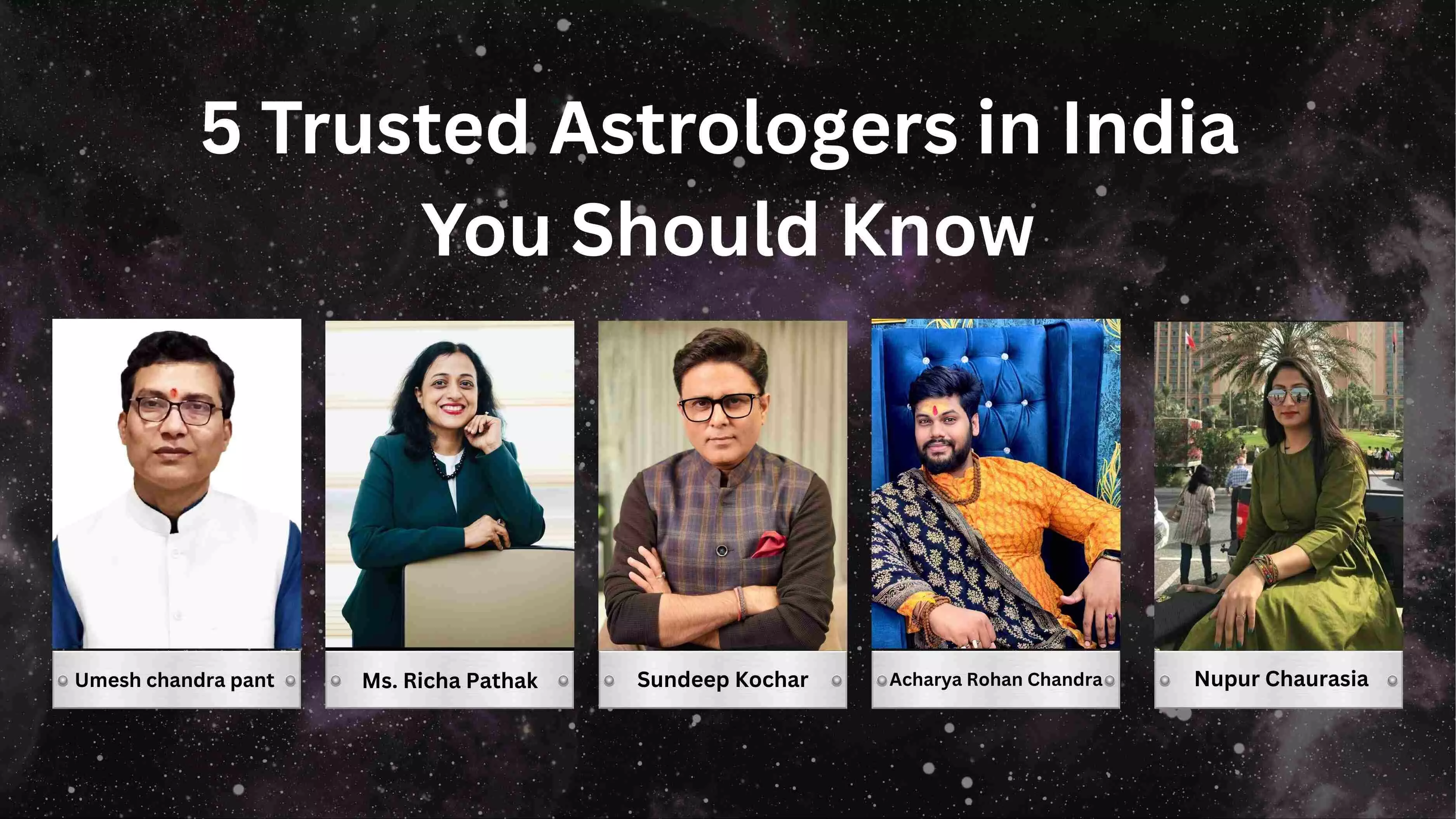 Top 5 trusted astrologers in India for 2026, featuring Pt. Umesh Chandra Pant, Richa Pathak, Sundeep Kochar, Acharya Rohan Chandra, and Nupur Chaurasia, known for ethical Vedic astrology, accuracy, and modern guidance.