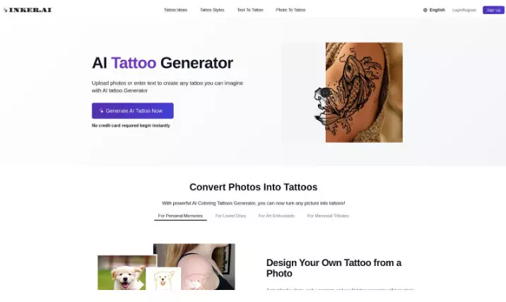 Generates high-quality, unique tattoo designs in minutes; Supports a wide range of styles (like rose tattoo ideas, black and gray, watercolor, and more); Free plan available with 3 trial designs; Affordable, flexible pricing for more designs