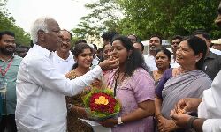 Minister Konda Surekha and MLAs feeding sweets to Kadyam Kavya who won as Congress Warangal parliamentary candidate with a huge majority on Tuesday