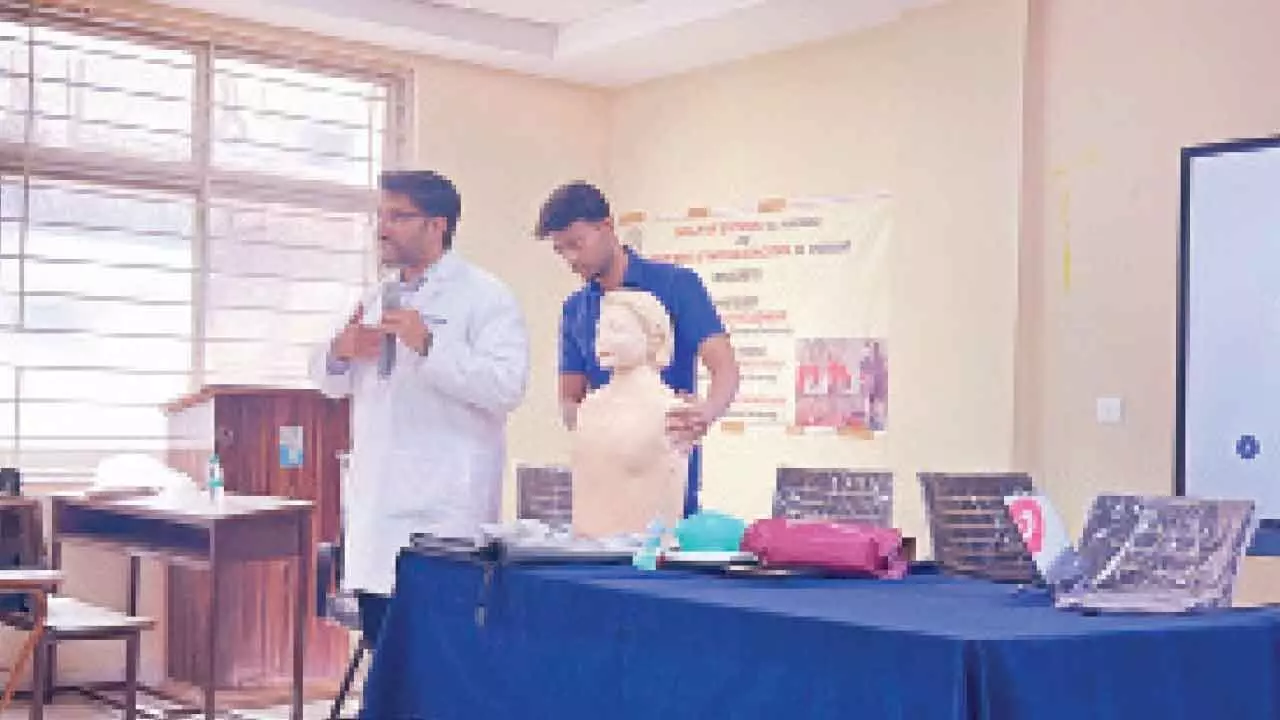 Dr Imran Sharif of AIG Hospitals, Banjara Hills, demonstrating First Aid and CPR techniques during the Faculty Development Programme – a One Week Workshop on Physical Education and Sports Science at the Conference Hall, School of Education, University College of Education, Osmania University on Thursday.