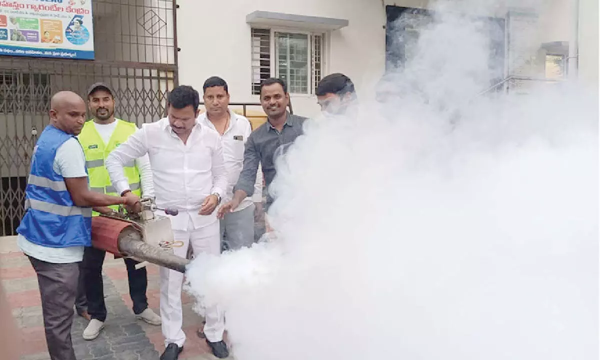 In the LB Nagar zone fogging was taken up in Kapra, Uppal, Hayathnagar, Hastinapuram and Saroornagar, besides Charminar areas, including Malakpet, Santoshnagar, Chandrayanagutta, Falaknuma, Rajendranagar, Mehdipatnam, Karwan, Goshamahal, Khairatabad, Jubilee Hills (Khairatabad circle).