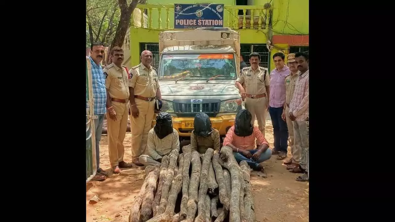 As part of combing along with FRO Malyadri, FBO Adiseshaiah and other forest officials near Chavatapalem forest area on Thursday, RSI Vishnu Vardhan Kumar team checked vehicles. They found a Bolera vehicles suspicious and stopped it. After seeing the task force personnel, smugglers in the vehicle tried to escape, but police nabbed three persons. The arrested were from Chittoor district. A case was registered and investigation is on.