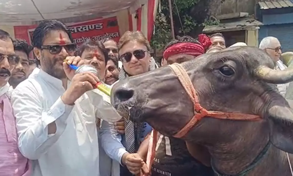 Dramatic protest in Jhansi: Chains, placards, and a buffalo lead power outage outcry
