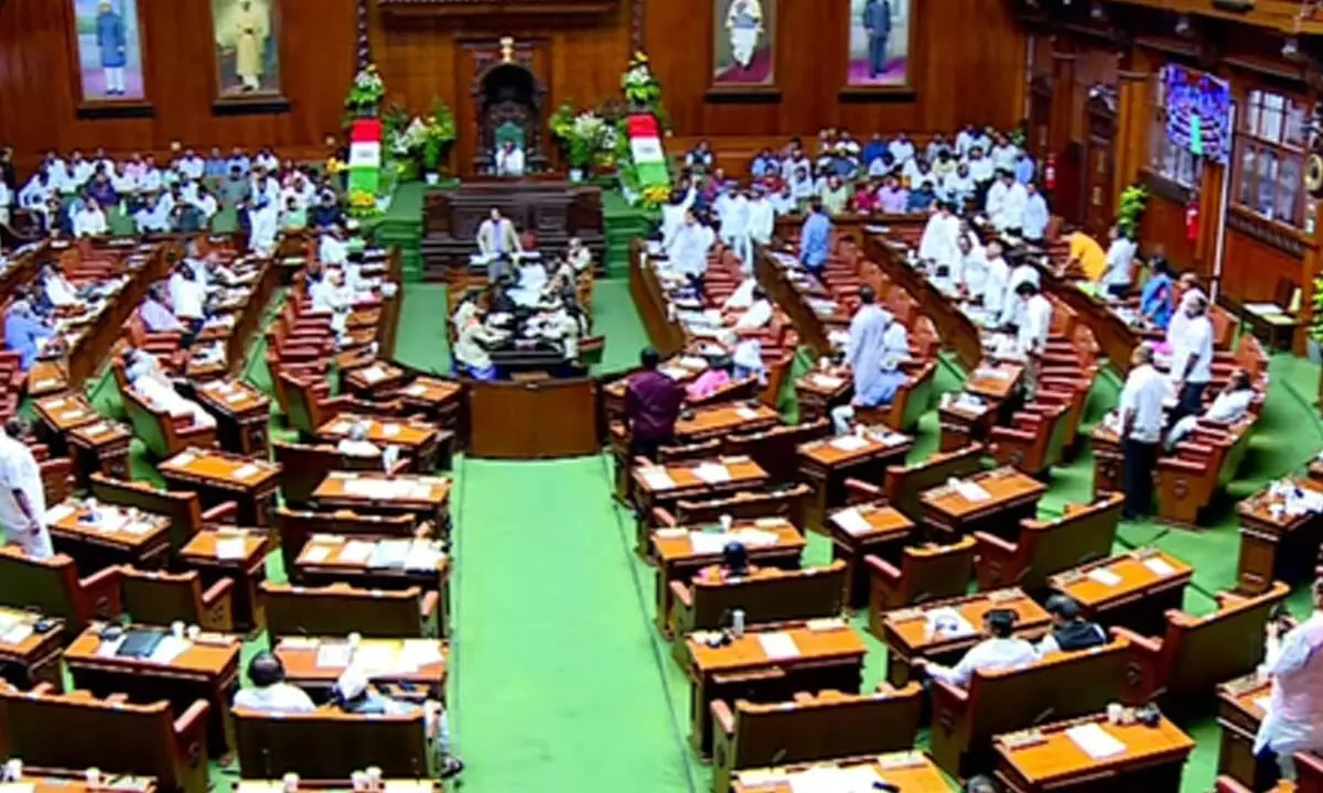 Bengaluru: Members of the Karnataka Bharatiya Janata Party (BJP) staged a protest in the Well of the state Assembly on Friday, demanding the resignation of Excise Minister R.B. Thimmapur in connection with an alleged corruption case.