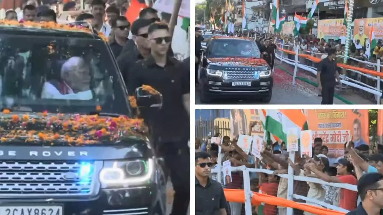 The journey took more than an hour as the PM's vehicle moved at a snail's pace. Thousands of people gathered on two sides of the road and on rooftops to catch a glimpse of Modi, who greeted them from inside his car with folded hands and a wave. Huge posters and banners, with the PM's picture alongside the bold inscription 'Operation Sindoor', which saw Indian armed forces destroying terror hideouts deep inside Pakistan, dotted the route. Security personnel frantically tried to keep pace with the PM's vehicle, amid showers of flower petals by people standing behind barricades, many of whom waved the national flag and chanted "Bharat Mata Ki Jai".