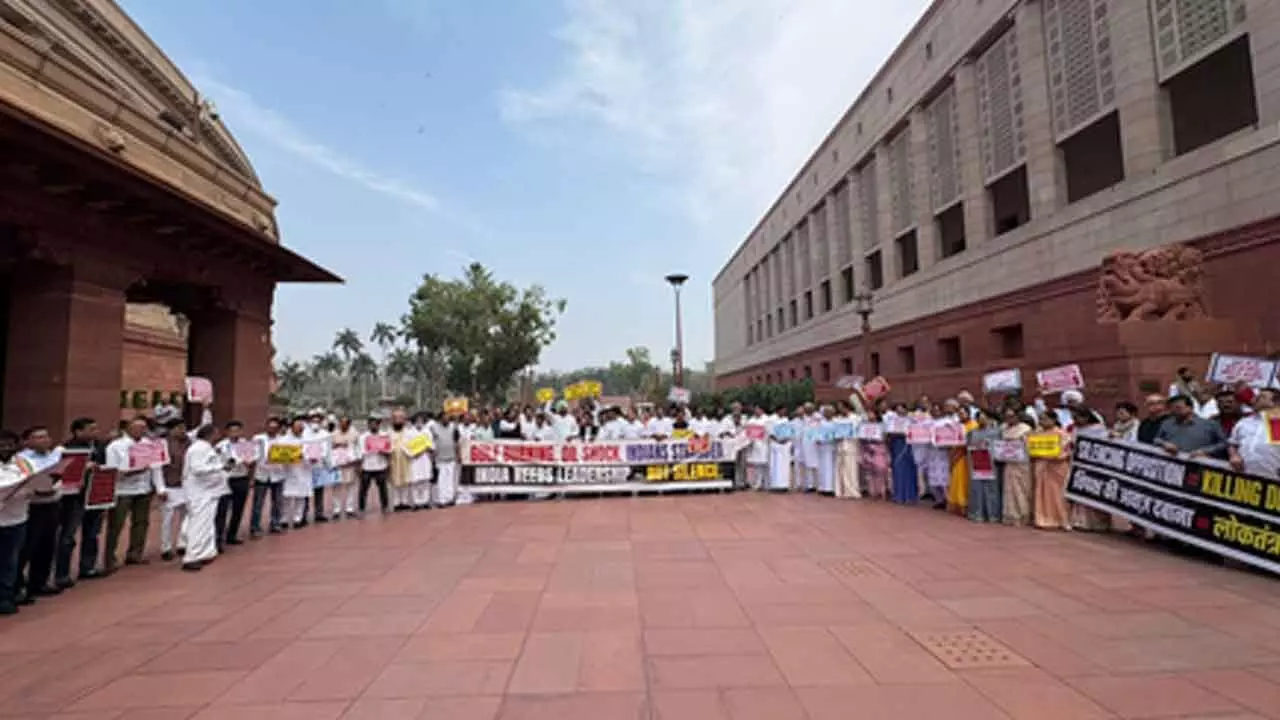Opposition MPs, led by Leader of Opposition in the Lok Sabha, Rahul Gandhi, staged a protest in the Parliament complex on Monday, accusing Prime Minister Narendra Modi of maintaining "complete silence" on the ongoing Gulf conflict and its potential impact on India’s economy and citizens abroad.