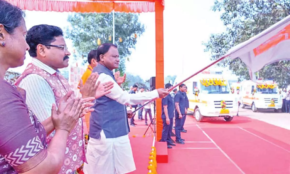 Bhubaneswar: OdishaChief Minister Mohan Charan Majhi flagged off 150 new ambulances under the Emergency Medical Ambulance Service in the State. The State government has procured as many as 428 new ambulances at a cost of Rs 111 crore, and the Chief Minister launched 150 of them in the first phase at a function held at Kalinga Stadium here on Tuesday.