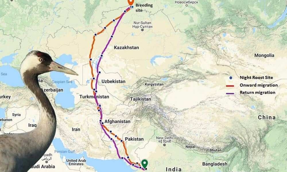 The tracking study (using GPS-GSM tag) documented in detail the migratory journeys of a Common Crane from its wintering ground in Gujarat to its breeding ground in Northern Kazakhstan and back.