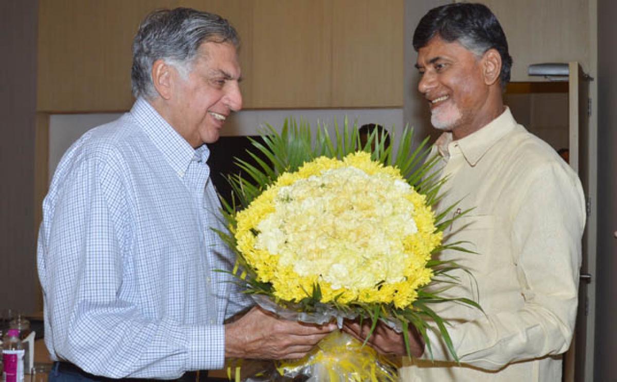 Tata Trust Chairman Ratan Tata addressing industrialists at a programme held in Vijayawada on Monday heaped praises on Andhra Pradesh Chief Minister N Chandrababu Naidu and said that the Chief Minister works hard to reach his goals.