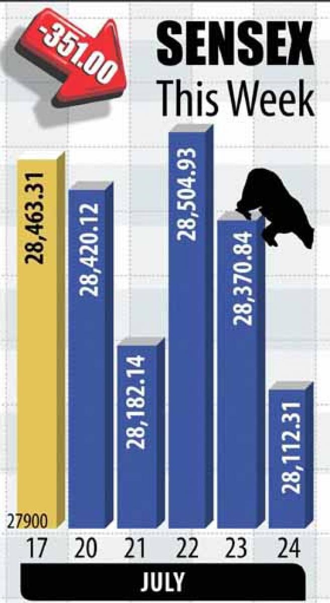 Fears over corporate earnings numbers and hiccups in the on-going Parliament session affected the market sentiment during the last week. Lack of positive cues, fall in the rupee value and slump in Chinese economy were other major factors that pushed the market barometer, Sensex, down by 351 points to end at 28,112.