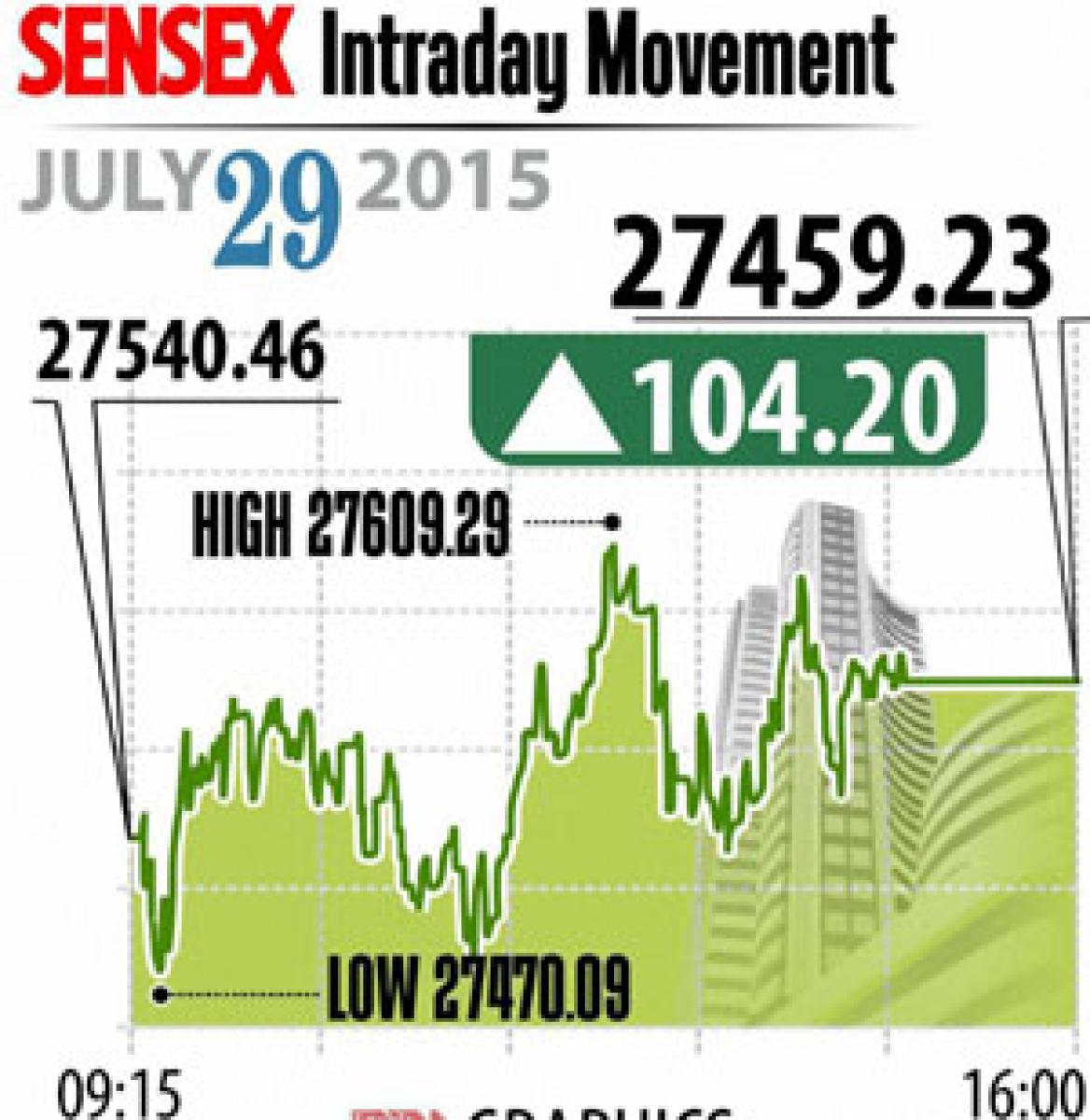 Sensex closed higher 104 points at 27,563 and Nifty ended up 38 points at 8,375. Meanwhile, the broader markets gained in tune with the index stocks with midcap and smallcap gaining 0.9 per cent and 0.8 per cent.