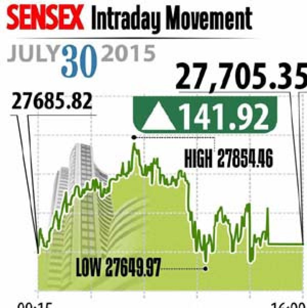 Mumbai: The benchmarking indices ended higher amid expiry of July derivative contracts, the government cleared GST amendment bill. Also the markets get support from global cues like US Fed statement. Sensex ended up 142 points at 27,705 and Nifty closed higher 47 points at 8,422.
