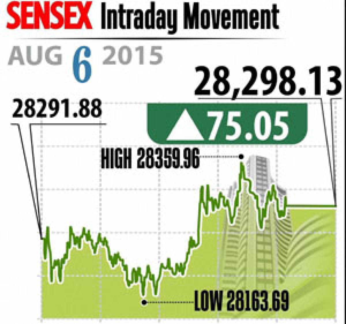 Also the government's decision to defer EU proposed free trade agreement following EU banning sale of about 700 drugs which were clinically tested by GVK Biosciences added to investor sentiment. Sensex closed at 28,298 up by 75 points and Nifty ended up 21 points at 8589.