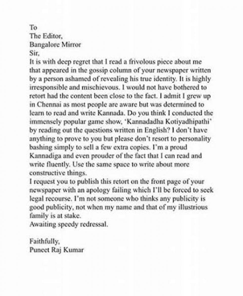 Puneeth slammed the Tabloid editor saying the article was not only false but also defamatory. Check out the letter he wrote to the editor of Bangalore Mirror.
