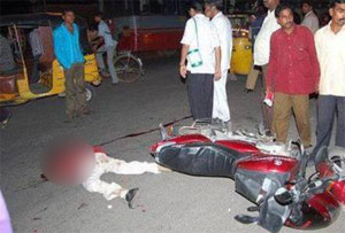 In yet another accident at Saroornagar, a man died on the spot while another sustained injuries when the bike they were riding was hit by another unidentified vehicle. The victim was identified as VM Chary (34) of Shaikpet and the injured Bhangari was admitted to Osmania General Hospital. The bodies of the deceased persons were shifted to OGH mortuary for autopsy.