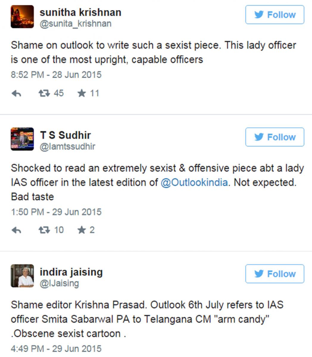 The article had also drawn a backlash from journalists and activists alike who termed the gossipy-news bit extremely sexist and offensive. Though the article does not name the officer, many have pointed out that the article alludes to Smita Sabharwal, the first female IAS officer to be appointed by the Telangana chief minister's office.