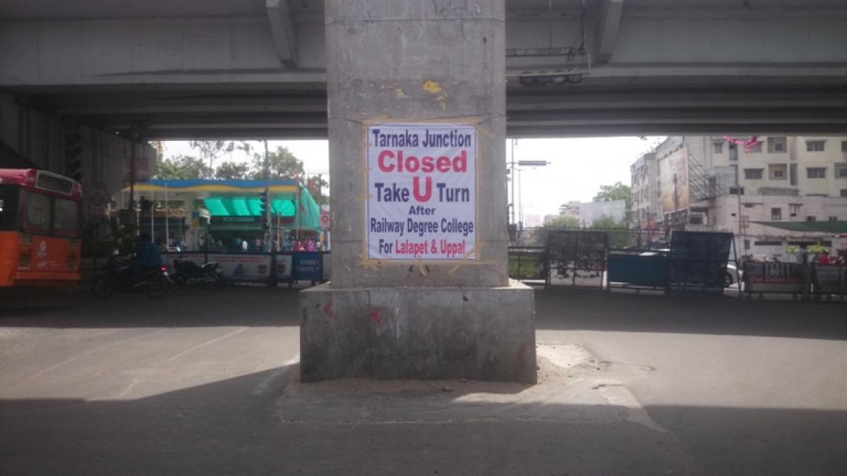 The Tarnaka junction aiding commuters to travel from Lalapet to Osmania University has now been barricaded permanently. A commuter traveling from the university will now have to take a u-turn at Railway Degree College to go to Lalapet. Meanwhile commuters from Lalapet have to take a u-turn at CCMB to reach the university.