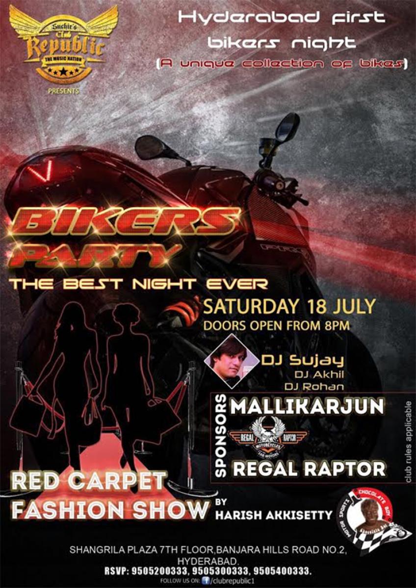 Red Carpet Fashion Show To Add Colour To Hyderabad’s First Bikers Night On 18th July. Bike lovers have some good news from Fab Regal Raptor Motor Cycles. Get a chance to see a unique collection of bikes at one place this Saturday night.