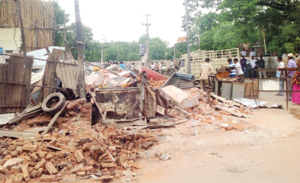 The encroachers staged a dharna stating that no notice was served to them prior to demolition. Syed Ahamed Pasha Quadri, MLA, Charminar, opposing the drive, said, “SCB should provide a specific notice and reasonable time for the encroachers to vacate the premises. My request to the board to allow time till Sunday on sympathetic grounds has gone in vain.”